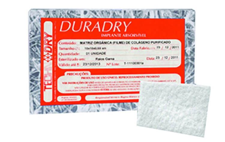 Tem ainda indicação como reparo de membranas que revestem órgãos internos ou vasos que apresentam lesões ou falhas da sua continuidade. Indicado para reparação e correção de defeitos (retração e encolhimento) de dura-máter causadas por lesões traumáticas e/ou procedimentos cirúrgicos, que sejam cranianos ou da coluna vertebral. Indicado também como redutor de adesão da peridural por fibrose pós cirúrgica. O Duradry em forma de de filme, por poder ser suturado com tensionamento, pode ser usado para prevenção de fístulas e vazamento liquórico.